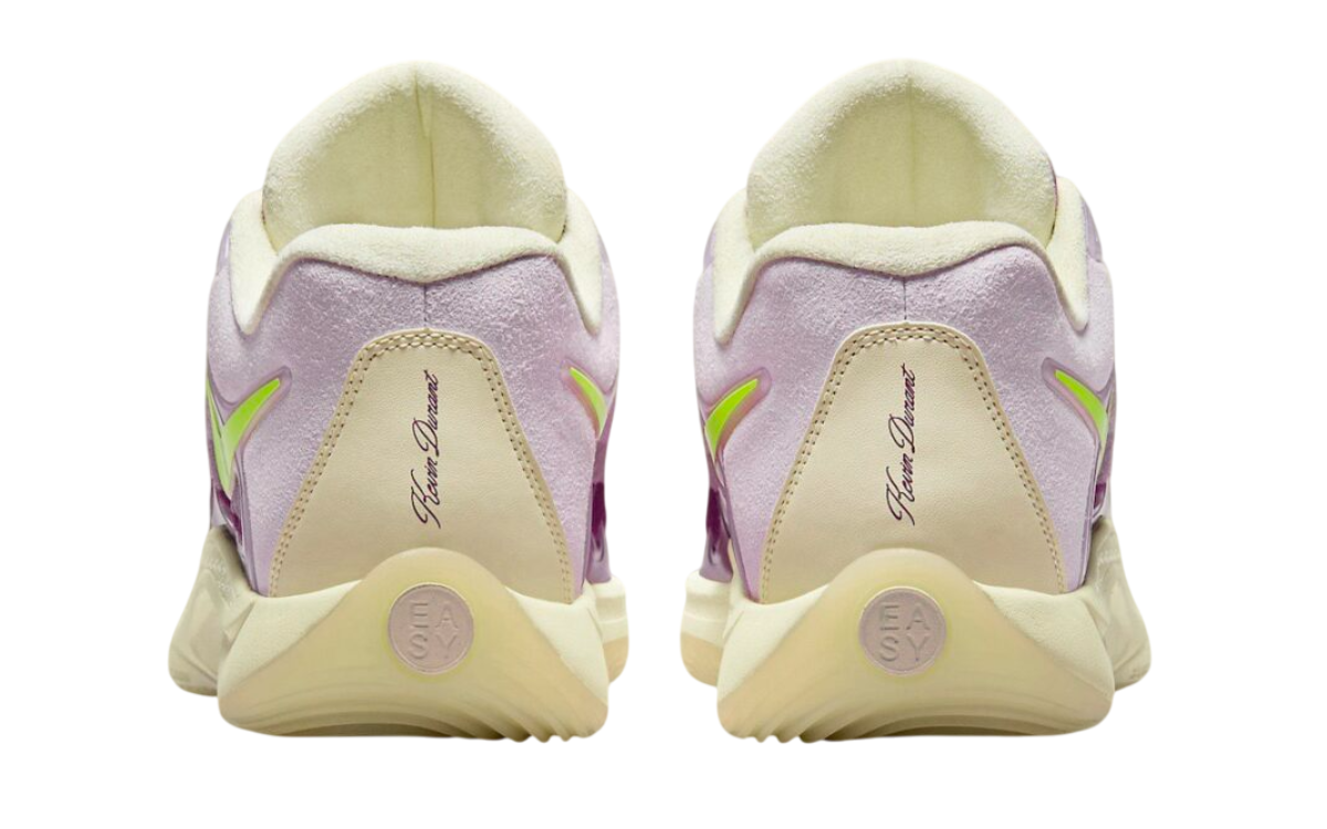 The Alchemist’s KD 17 features a vibrant color palette blending Coconut Milk, Laser Orange, Viotech, and Doll tones. Unlike Metro’s design, this version opts for a simpler approach, prominently displaying Alan’s ALC Records logo on the tongues. Transparent TPU overlays offer a glimpse of the upper, while a coconut milk midsole and semi-translucent outsole add a sleek touch.